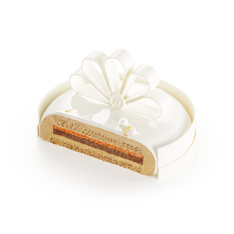 Đậm đà vị trà Earl Grey trong lớp kem mousse, cùng sự tươi mới của mứt cam ruột đỏ được nấu chậm và chút ngọt ngào của lớp crémeux làm từ sô-cô-la đen, A Little Grace được trang trí với tone màu trắng và một chiếc nơ làm thủ công từ sô-cô-la mang lại vẻ ngoài nhẹ nhàng và tao nhã.