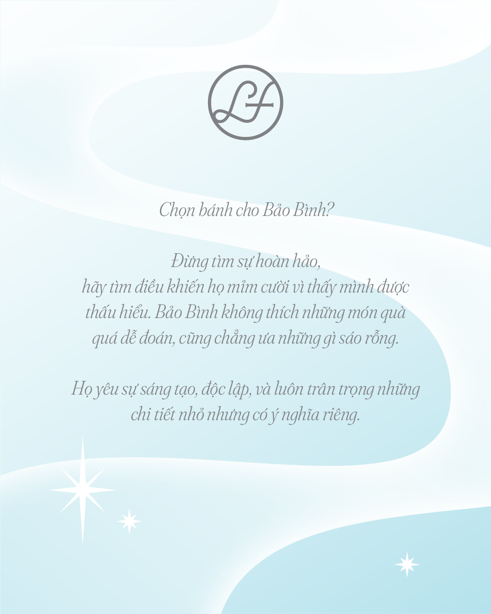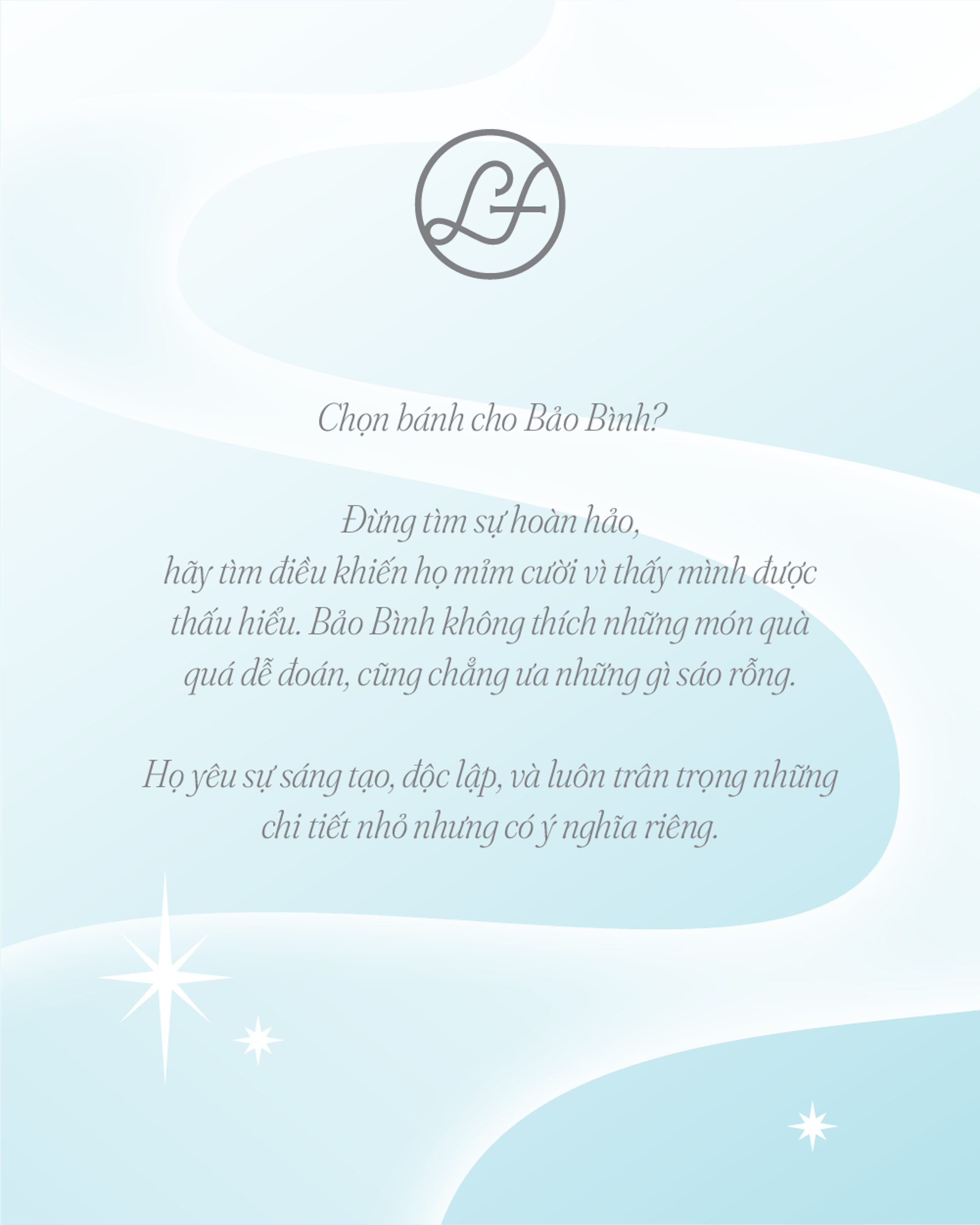 Nếu bạn đang muốn chọn một chiếc bánh cho Bảo Bình, người luôn khiến bạn bật cười với những ý tưởng không giống ai, nhưng lại âm thầm quan tâm bạn theo những cách rất riêng thì LaFuong có vài gợi ý nho nhỏ dưới đây nè!