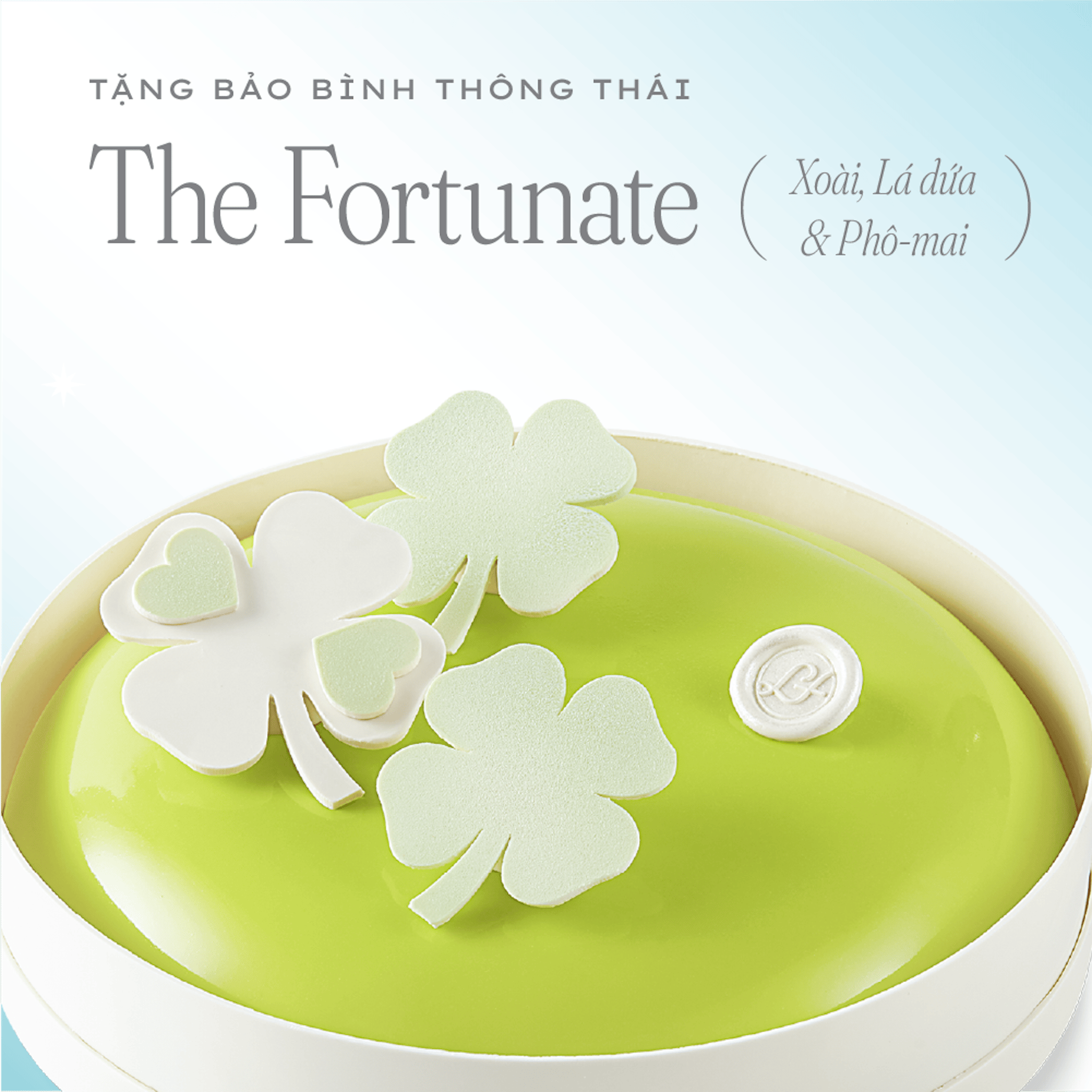 Mousse Xoài – Lá Dứa – Phô Mai, tươi sáng và tinh tế như cách Bảo Bình nhìn đời. Tạo hình cỏ bốn lá đại diện cho niềm tin vào sự may mắn vì chúng ta đã là bạn của nhau.