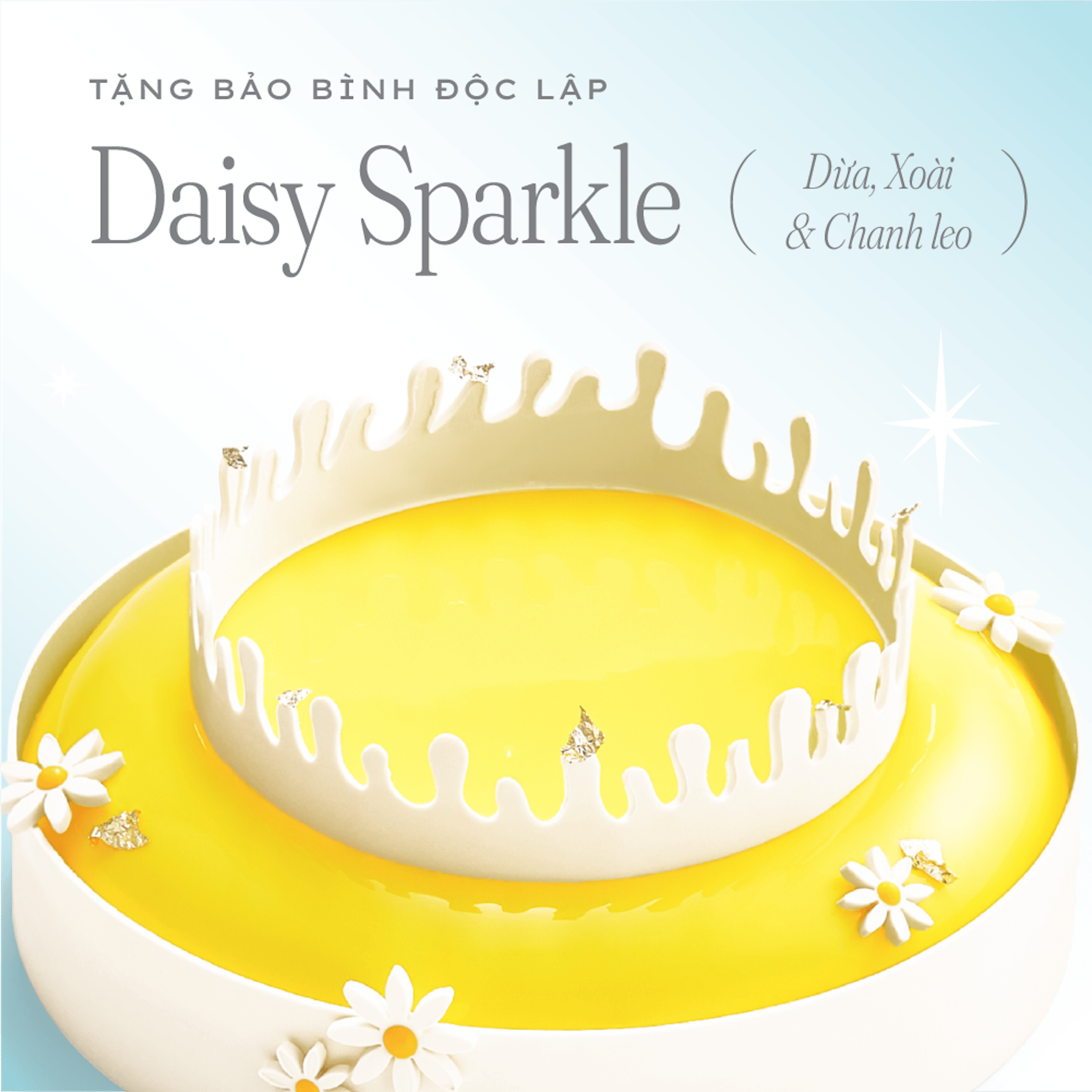 Mousse Dừa – Xoài – Chanh leo, bùng nổ hương vị như những câu chuyện bất ngờ từ một Bảo Bình vui tính. Tạo hình vương miện hoa Daisy như chính năng lượng lạc quan của họ mỗi ngày.