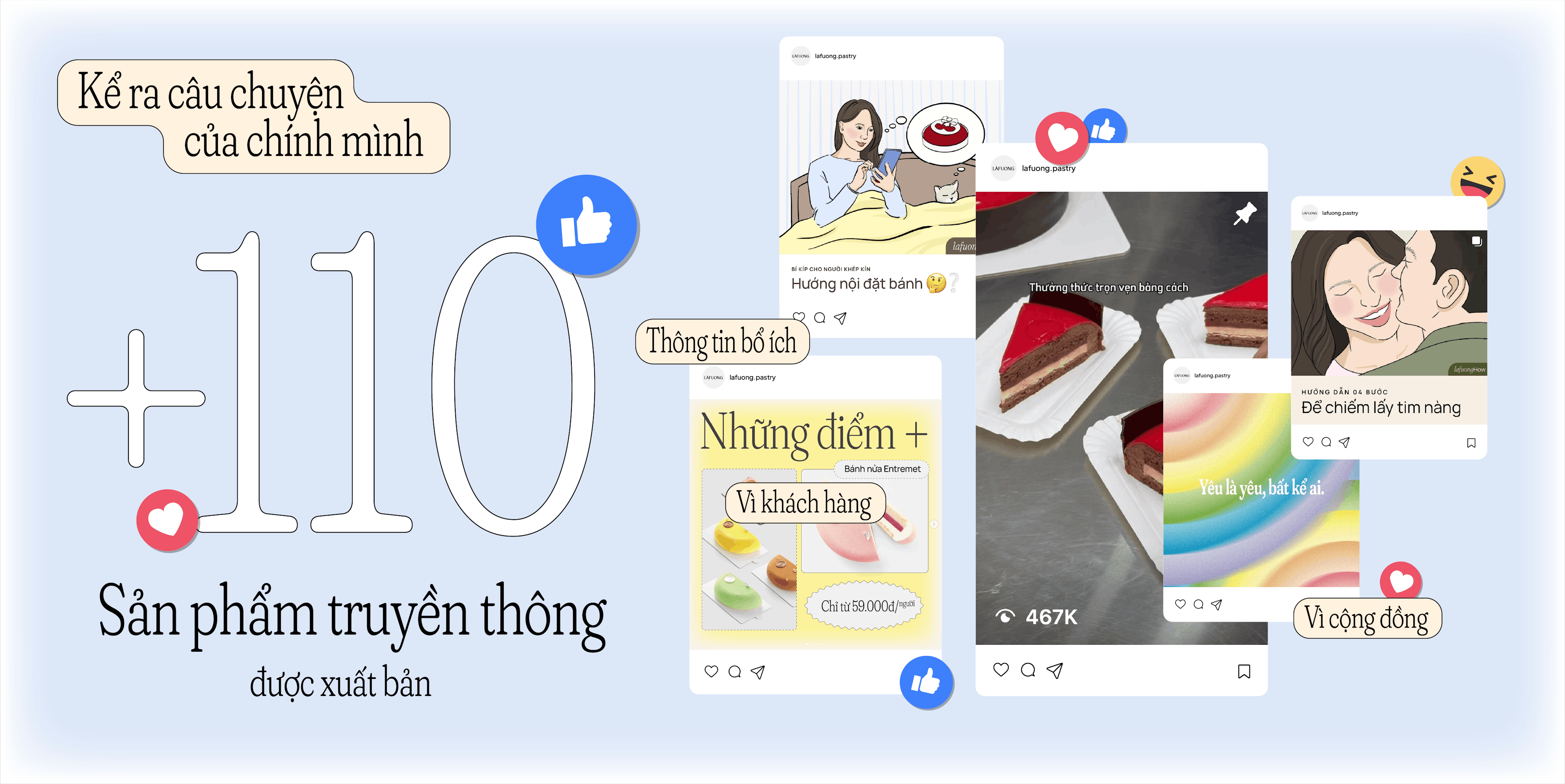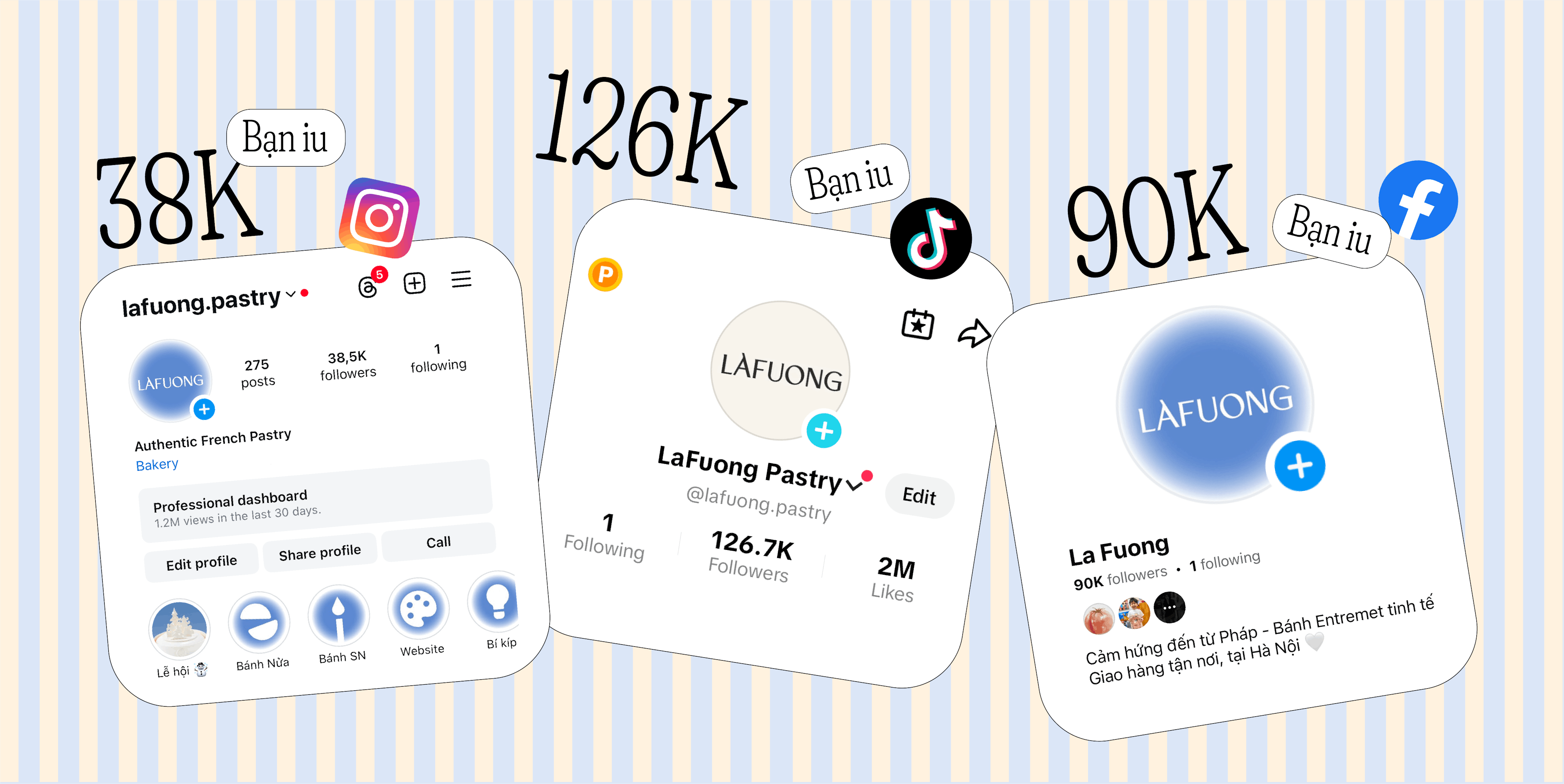 LaFuong mừng vì đã kết bạn với 126.000 người trên TikTok, 90.000 trên Facebook và 38.000 trên Instagram. Đó không chỉ là những con số, mà là những người bạn mới cùng chia sẻ niềm đam mê với bánh ngọt. Đối với chúng tôi, mỗi người theo dõi mới đều là một lời nhắc nhở tuyệt vời rằng chúng tôi đang làm được những điều đúng đắn 🥳