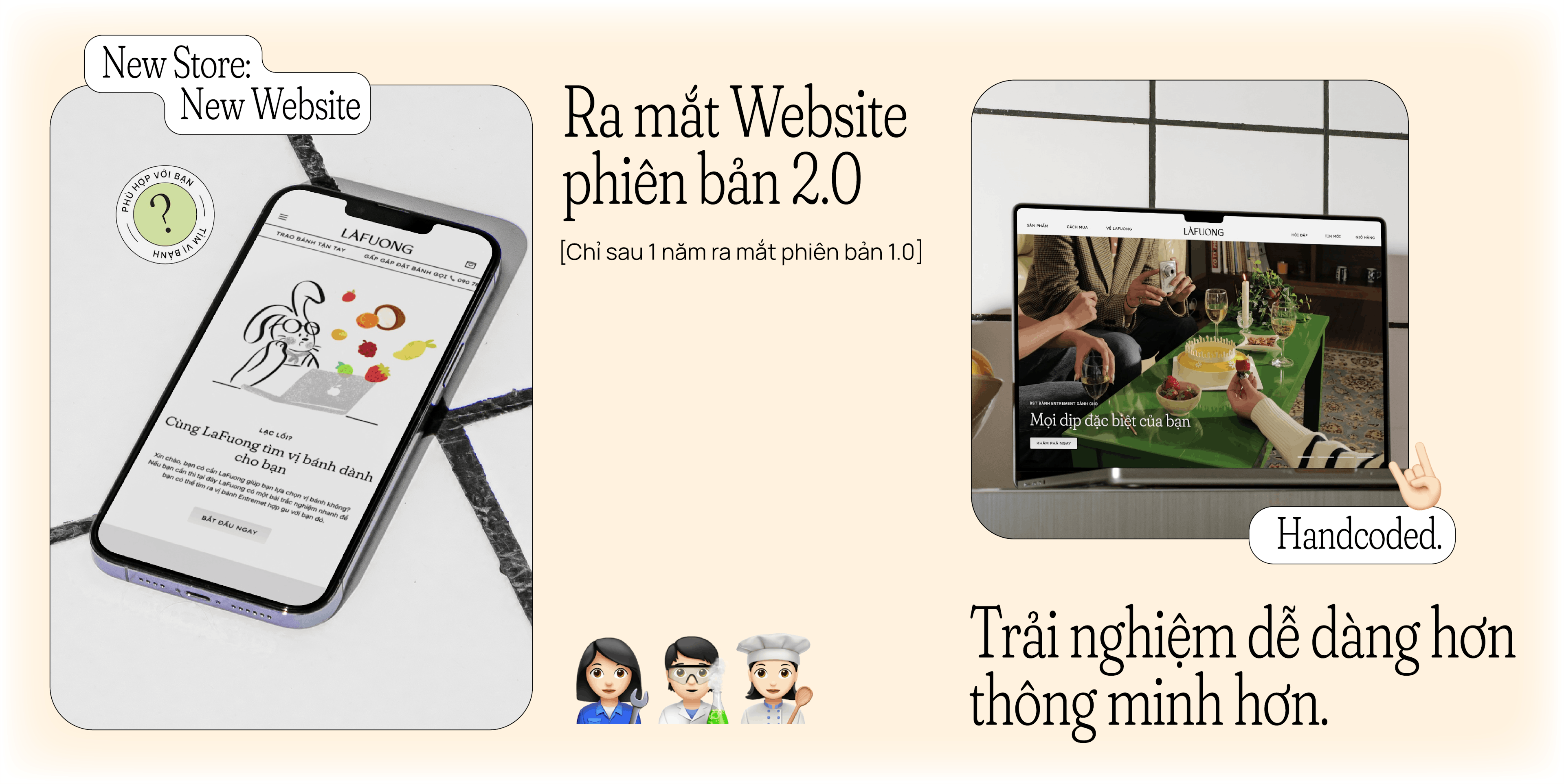Trong gần 1 năm, với tiêu chí lấy người dùng làm trọng tâm, mọi chi tiết từ kiểu chữ, màu sắc cho đến những trải nghiệm tương tác đều được đội ngũ của LaFuong nghiên cứu, thiết kế và thử nghiệm dựa trên những dữ liệu có được từ phiên bản 1.0 - tất cả là để nâng cấp một cửa hàng trực tuyến hiện đại hơn, tiện lợi hơn, giúp bạn dễ dàng tìm được chiếc bánh hoàn hảo cho riêng mình! 💅🏼