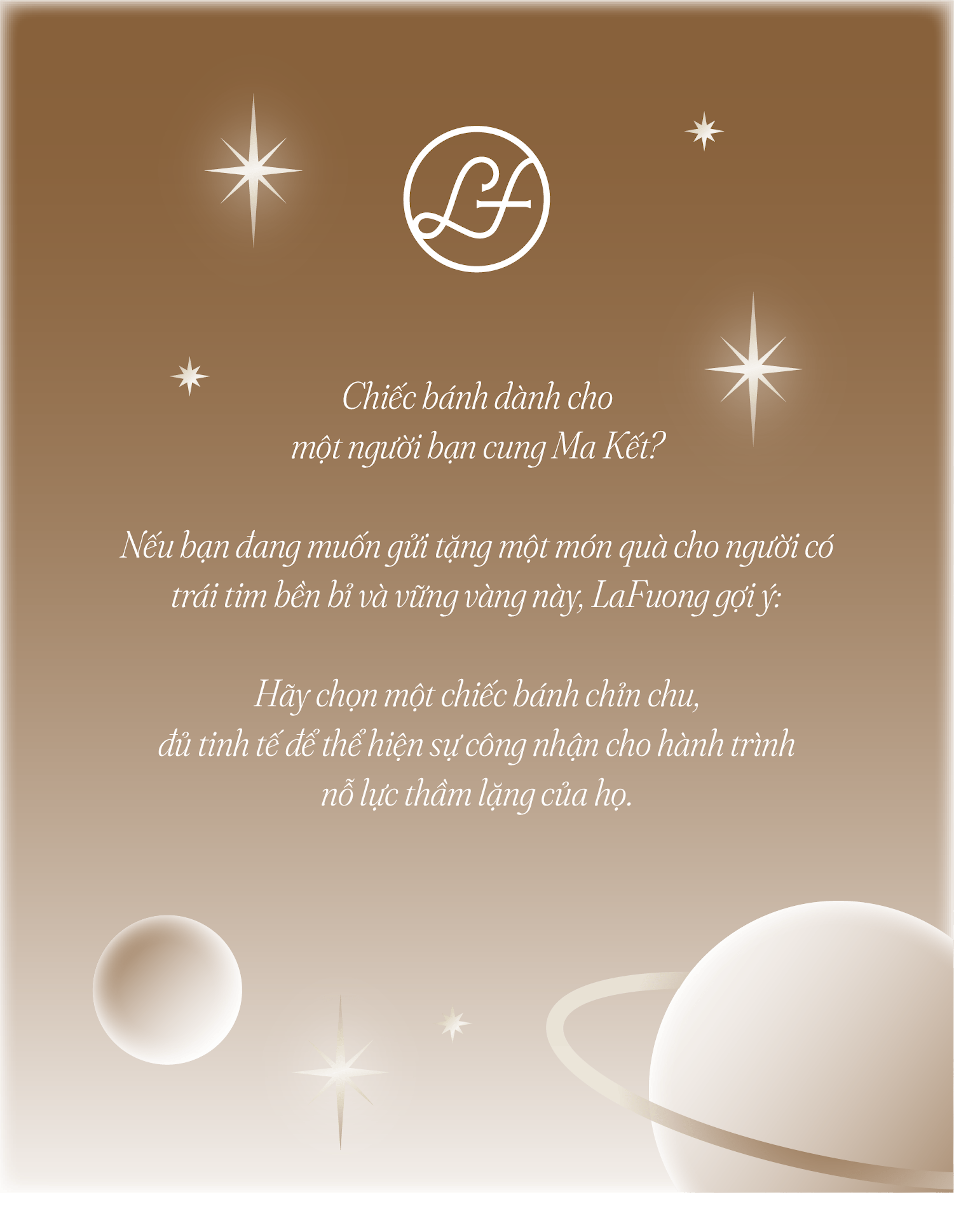 Nếu bạn đang muốn gửi tặng một món quà cho người sống có trách nhiệm và nhiều tầng suy nghĩ này, LaFuong gợi ý: hãy chọn một chiếc bánh đủ chỉn chu, tối giản và chiều sâu – như chính cách Ma Kết thể hiện tình cảm: lặng lẽ nhưng không bao giờ nửa vời.