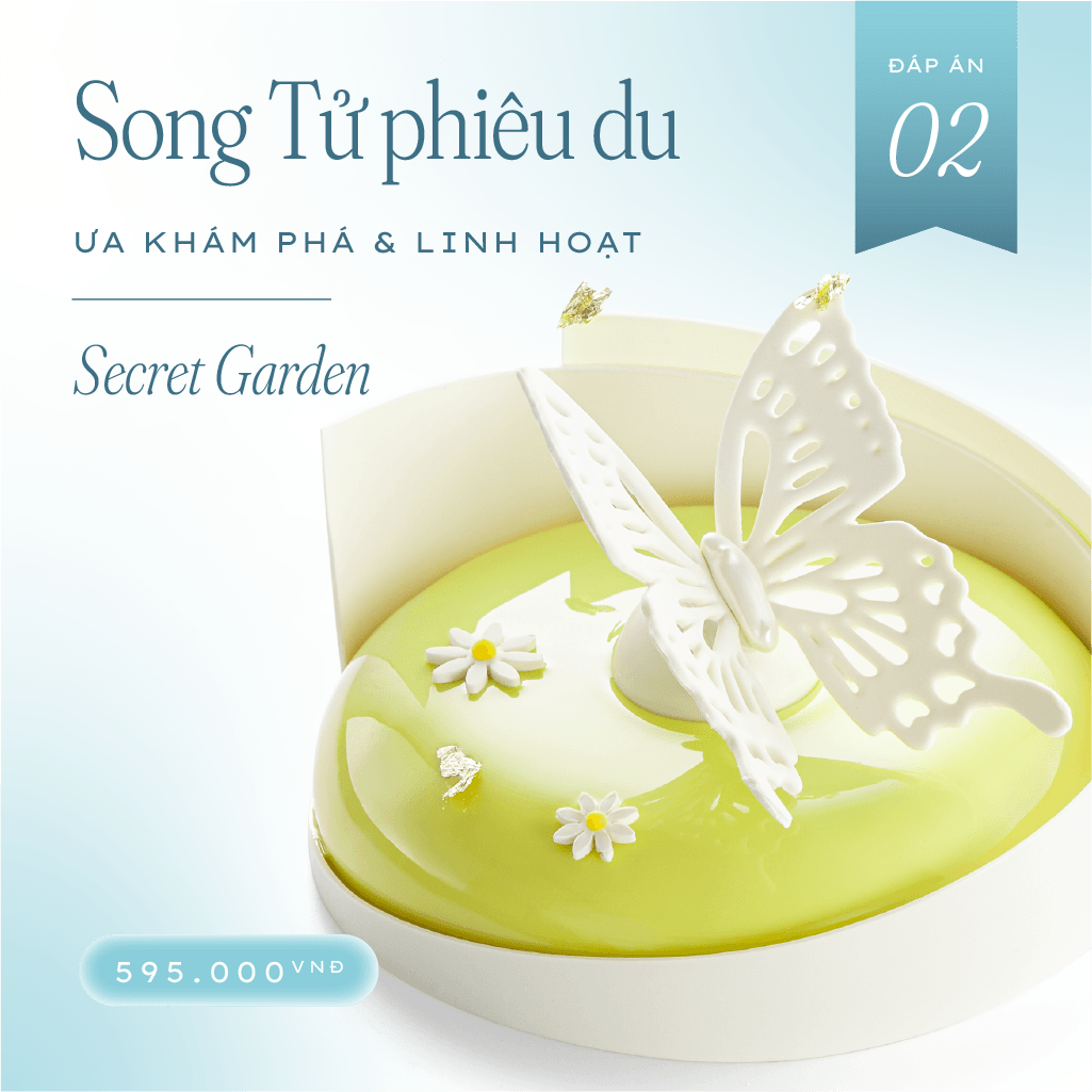 Secret Garden với tạo hình cánh bướm tự do, kết hợp vị Xoài, Lá Dứa & Phô Mai mang đến trải nghiệm đầy bất ngờ. Tầng bánh nào cũng là một lớp hương vị bùng nổ để kích thích trí tò mò của Song Tử 🤯