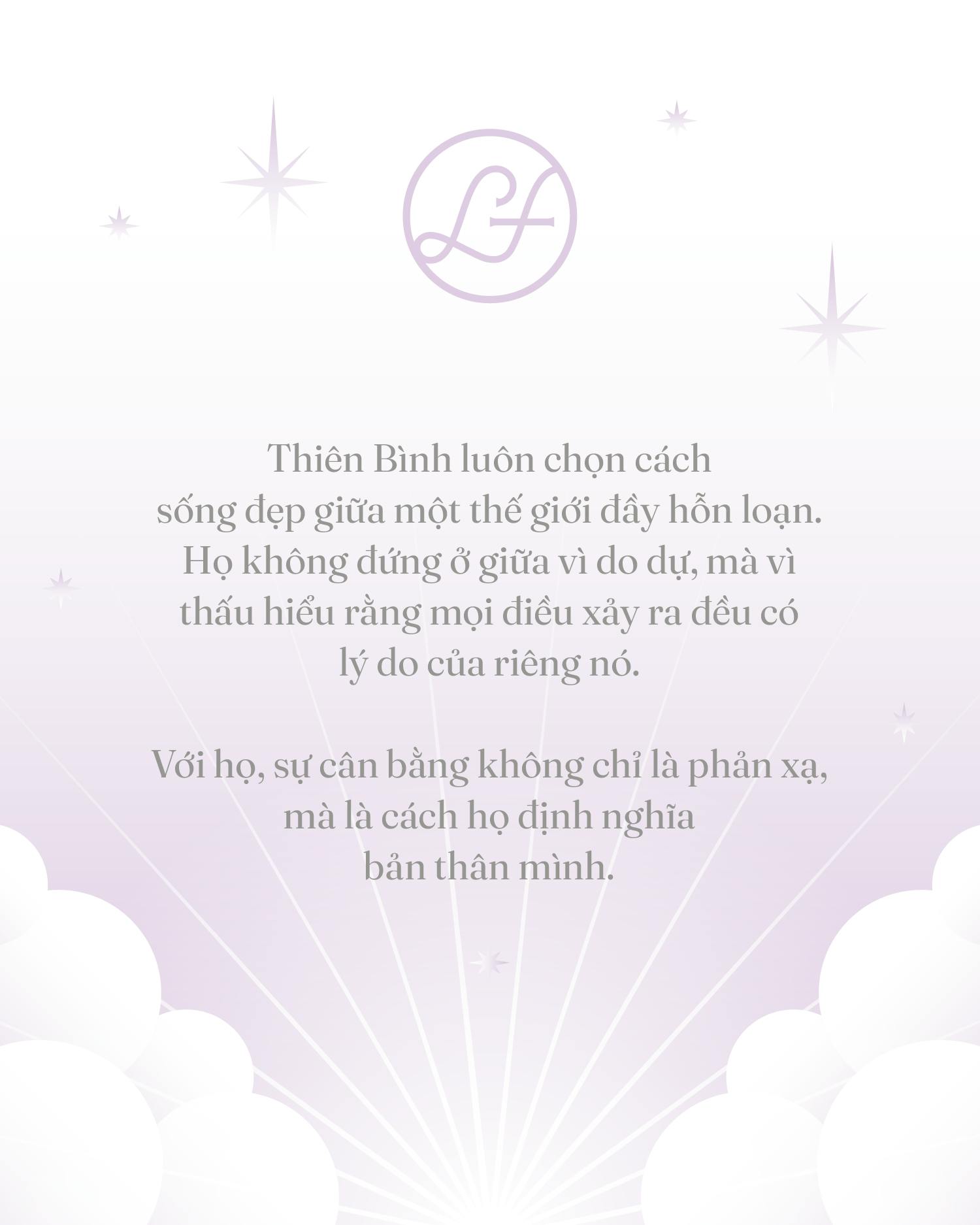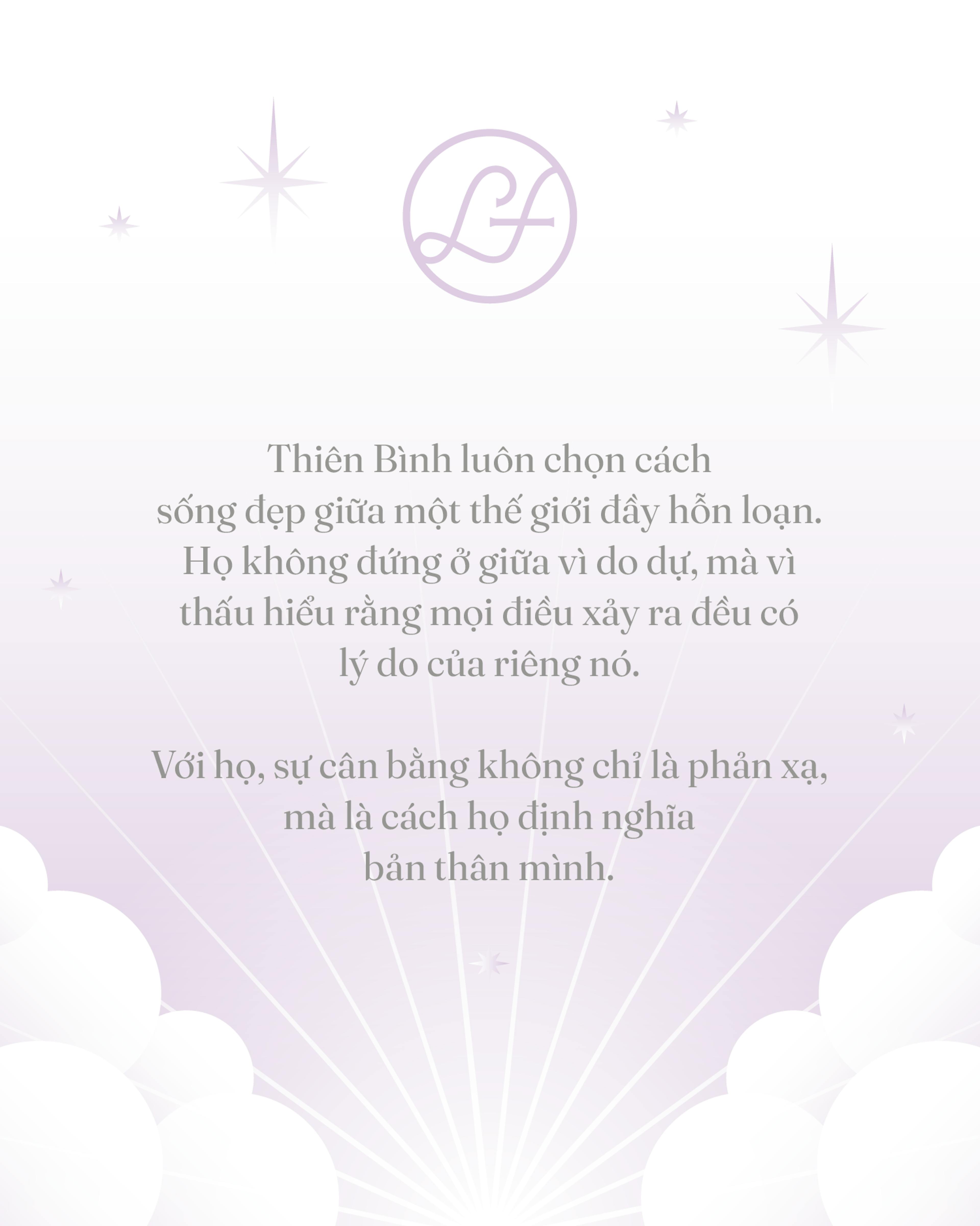 Vậy đó, Thiên Bình luôn chọn cách sống đẹp giữa một thế giới đầy hỗn loạn. Họ không đứng ở giữa vì do dự, mà vì thấu hiểu rằng mọi điều xảy ra đều có lý do của riêng nó. Sống bằng trực giác của sự cân bằng, Thiên Bình luôn biết khi nào nên nói, khi nào nên im lặng, khi nào nên giữ lại, và khi nào nên buông tay.