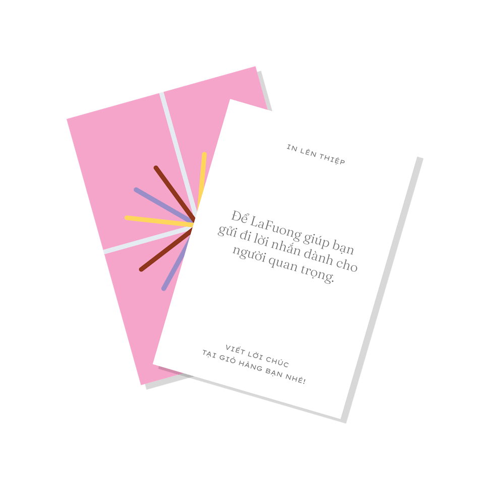 Không chỉ đơn thuần là tặng một chiếc bánh, LaFuong hiểu rằng mỗi món quà trao đi sẽ luôn đi cùng với những thông điệp quan trọng. Nếu bạn muốn gửi thiệp kèm bánh và không tiện tự viết tay, LaFuong sẽ giúp bạn in những điều bạn muốn gửi gắm lên thiệp hoàn toàn miễn phí.